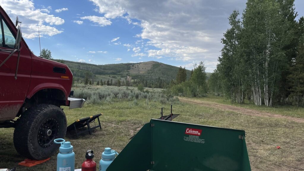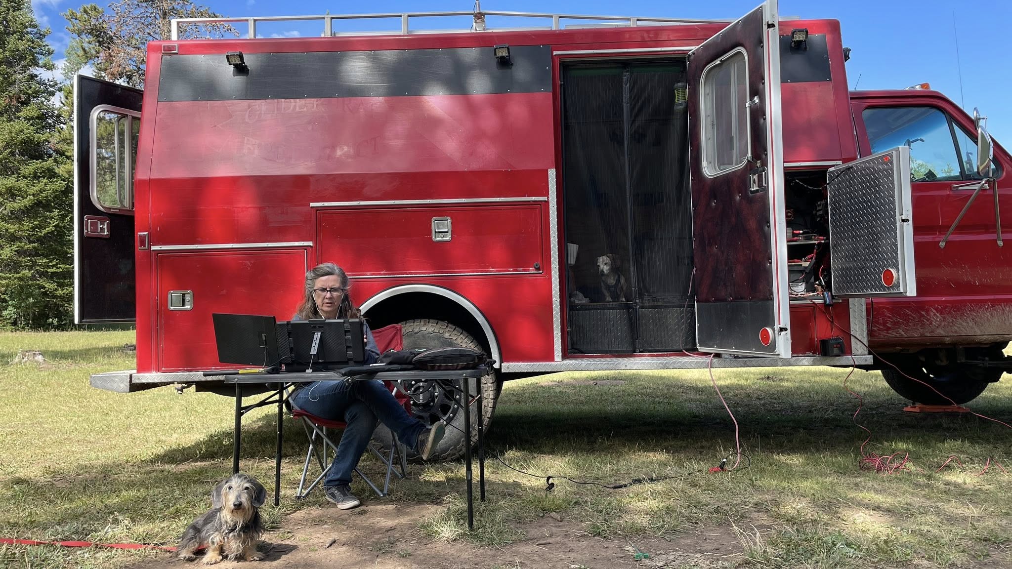As the morning light settled in, a light sprinkle began to fall. I glanced out the window and was surprised to see a moose not far in front of Clifford! I quietly stepped outside and managed to grab a few photos. The cool 57° air was brisk but refreshing. I wiped down the windows and set up a little outdoor office space for Gayla to enjoy. By mid-morning, the sun finally broke through and warmed things up.