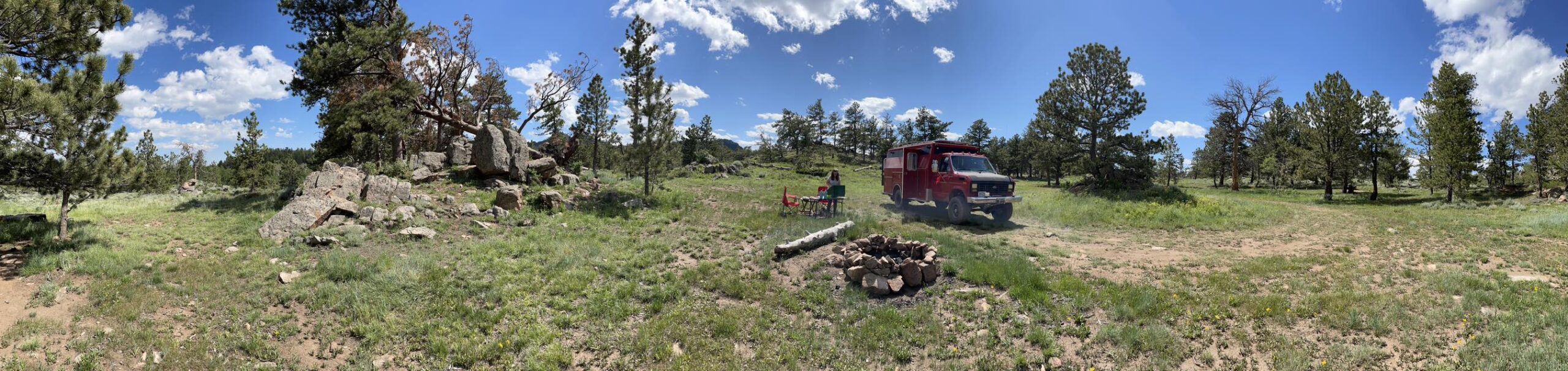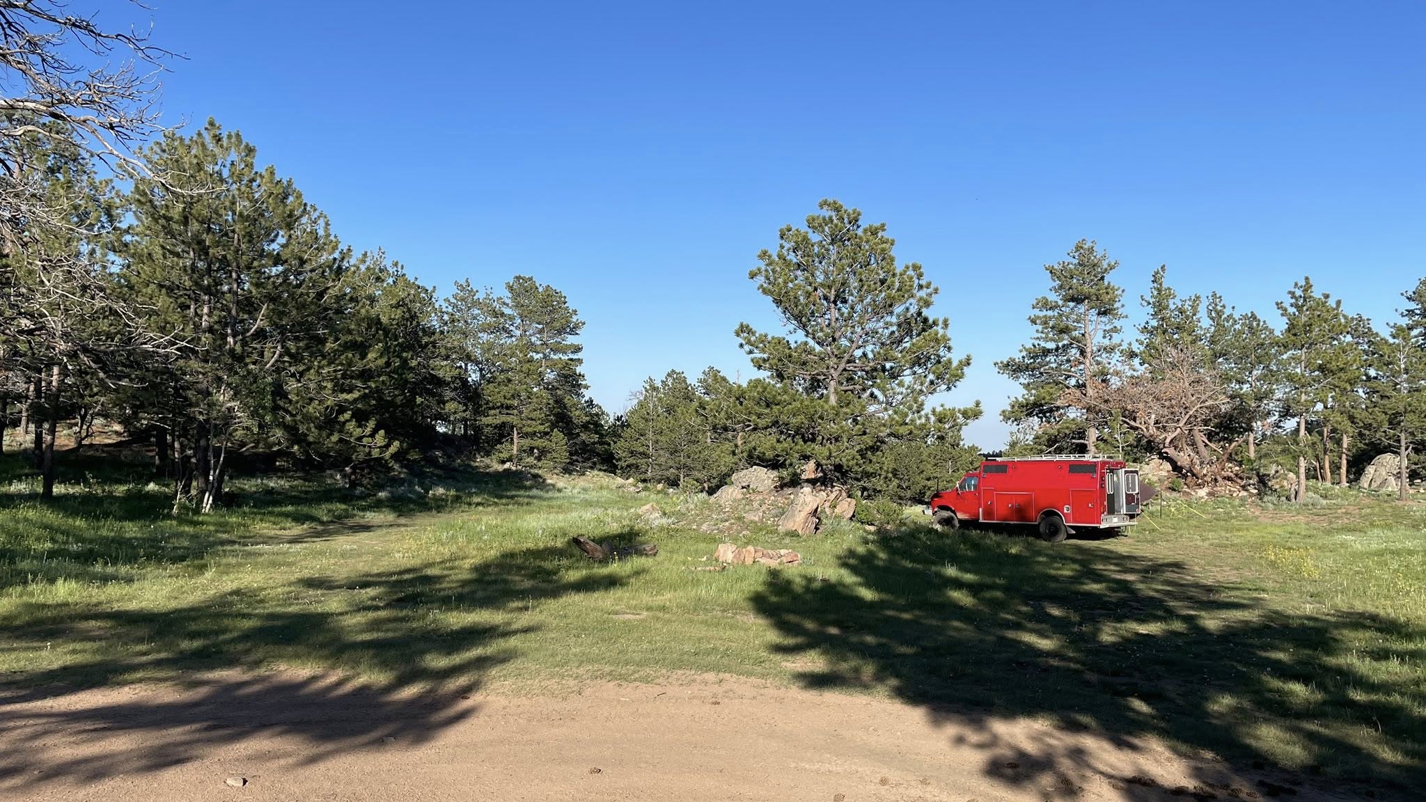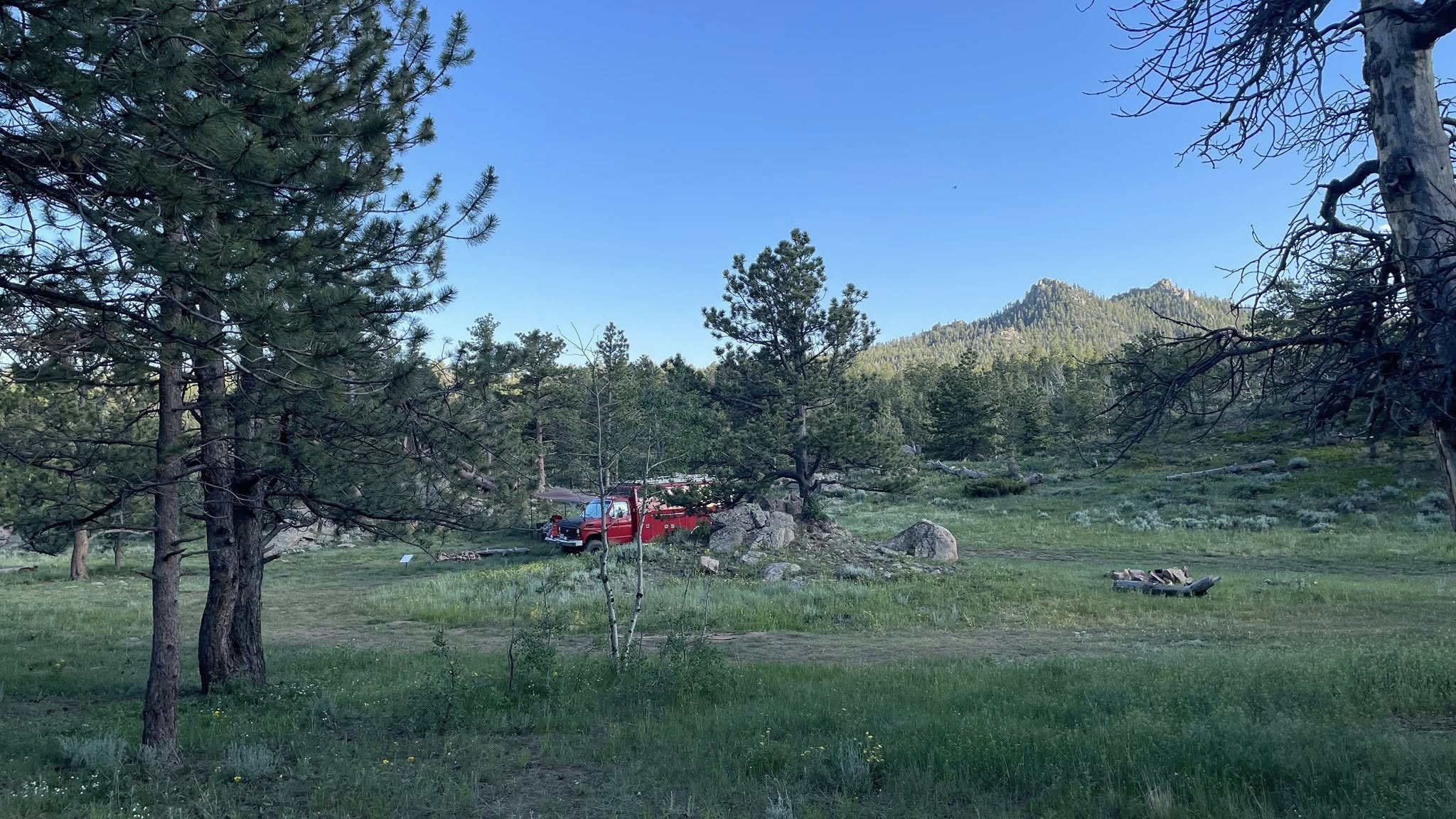 By 3 PM, we found a promising campsite at the end of a forest road. It was quiet, tucked away, and had three fire rings — clearly a favorite stop for other campers in the past. There was also a nice, level spot to park. Perfect.
