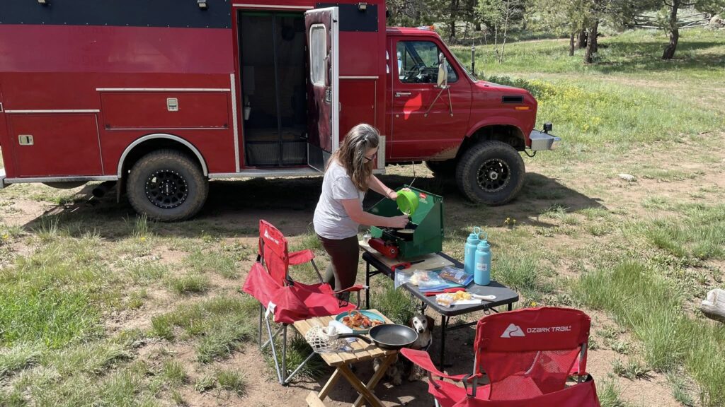 I was starving, so I got to work right away setting up the stove. We had beef brats and scrambled eggs with a side of bacon — a solid, satisfying low-carb meal.