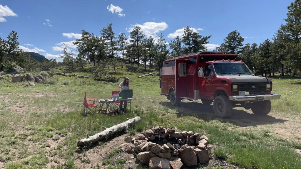 With our bellies full, we put up the 10×15 awning to give us some shade for working outside. There was absolutely no cellular signal here, so we set up Starlink. Gayla jumped right back into work. I wasn’t going to interrupt her flow.