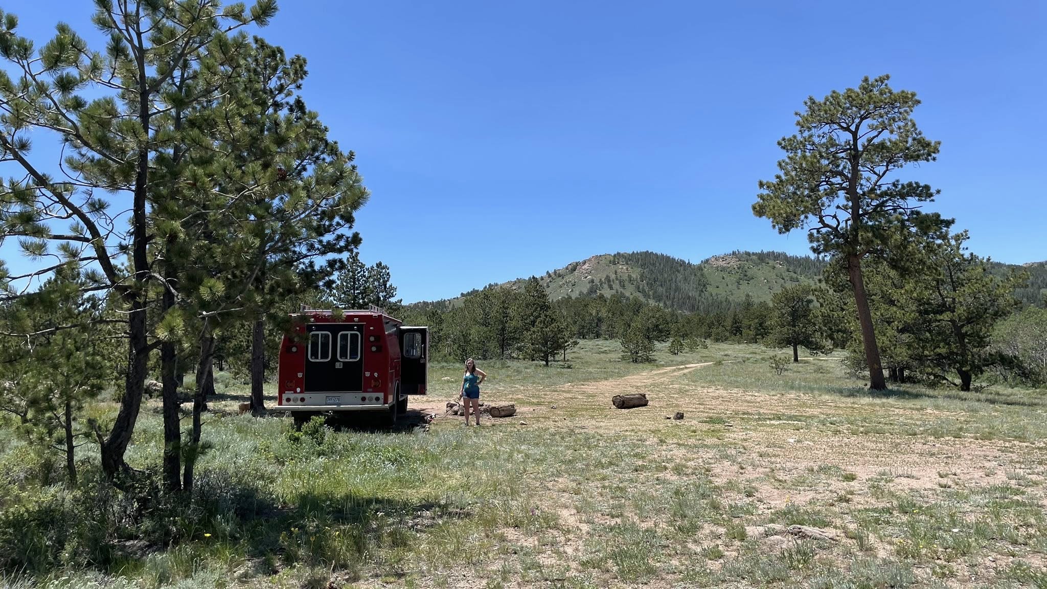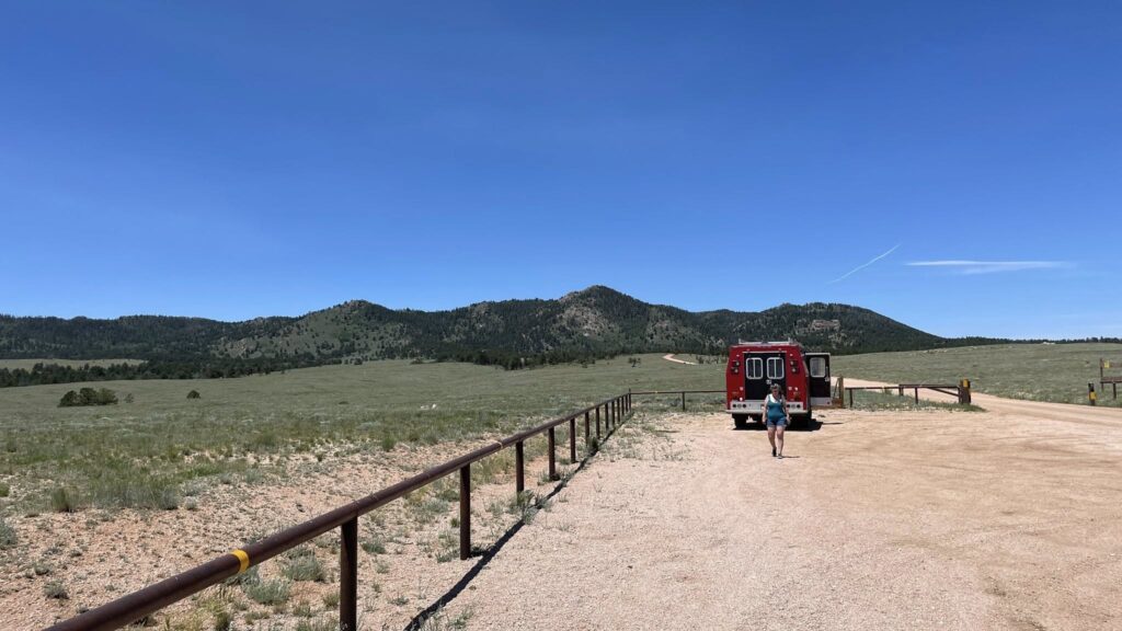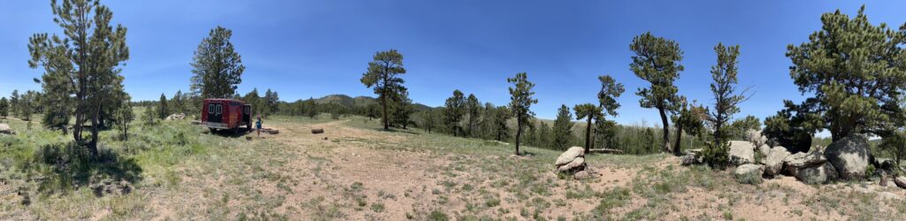 By noontime, we were more than ready for a meal—we hadn’t eaten anything since Freddy’s yesterday. We’re now way up Forest Road 707, surrounded by horse trailers and the buzz of race activity. I found us a tucked-away campsite off Browns Park Trailhead, which worked out perfectly.