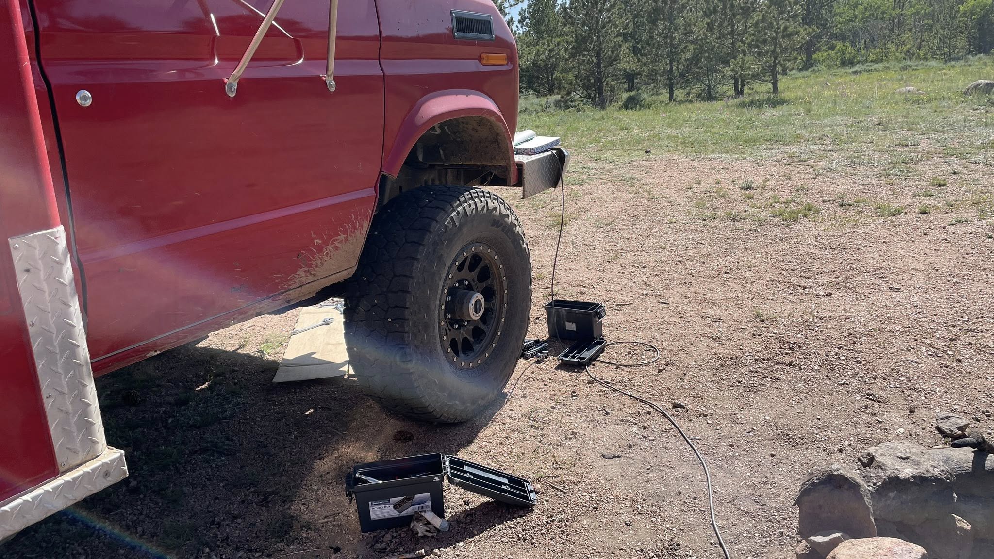 Later, I crawled under Clifford. I’ve been hearing a clunky noise when turning and wanted to figure it out. I checked the tightness on a few components, but everything seemed fine. With Gayla behind the wheel rocking it side to side, I spotted the issue: a bad tie rod end. Unfortunately, tightening didn’t help. And of course, it’s not your run-of-the-mill steering setup—it’s a crossover tie rod end for a Kingpin Dana 60 axle. The local parts store had no idea what I was talking about.